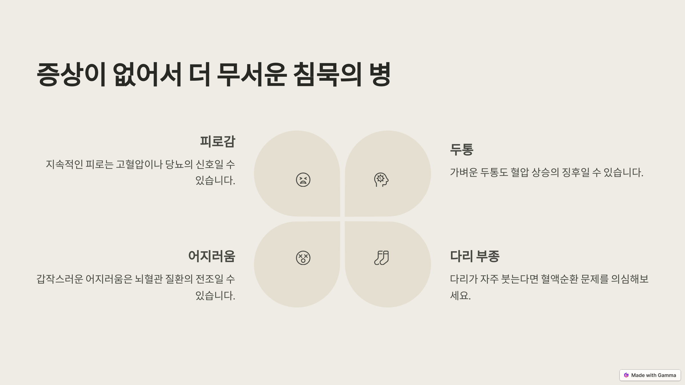 고혈압과 당뇨는 ‘조용한 살인자’라고 불릴 만큼, 증상이 없는 경우가 많아요. 피곤하거나, 머리가 살짝 아프거나, 다리가 붓는 증상도 그냥 넘기기 쉬운데… 이게 반복되면 뇌혈관 질환의 신호일 수 있답니다. 그래서 몸이 보내는 사소한 신호도 주의 깊게 보는 습관이 필요해요. 🤔