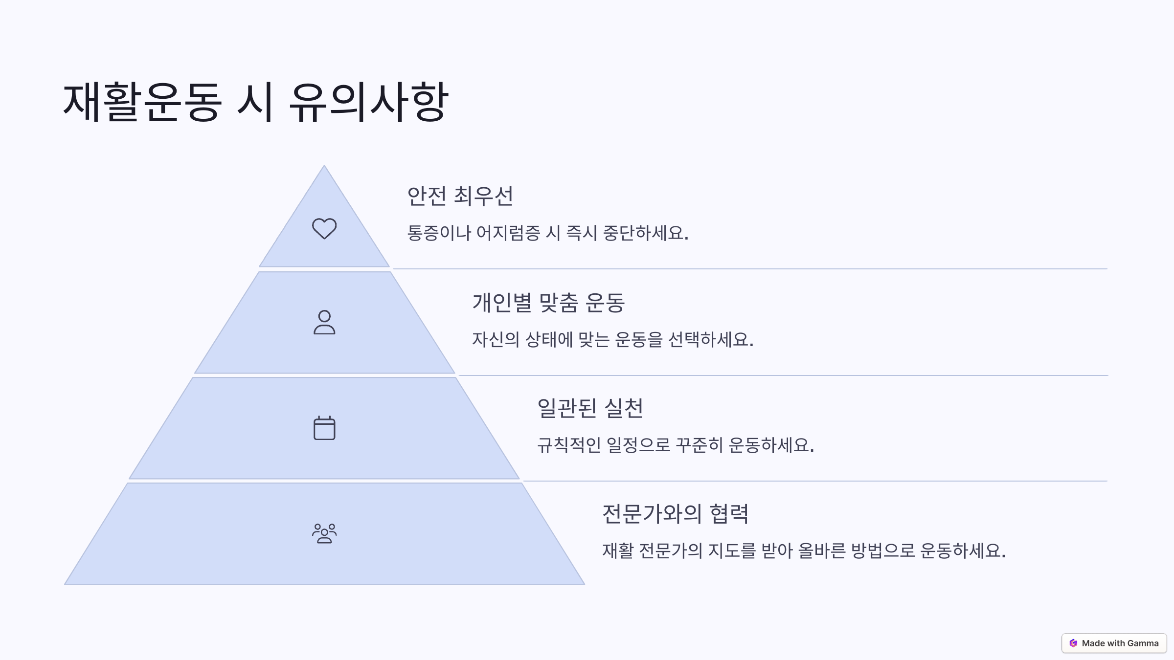 - 개인별 맞춤 운동: 자신의 현재 상태와 능력에 맞는 운동을 선택하여 무리하지 않도록 합니다.