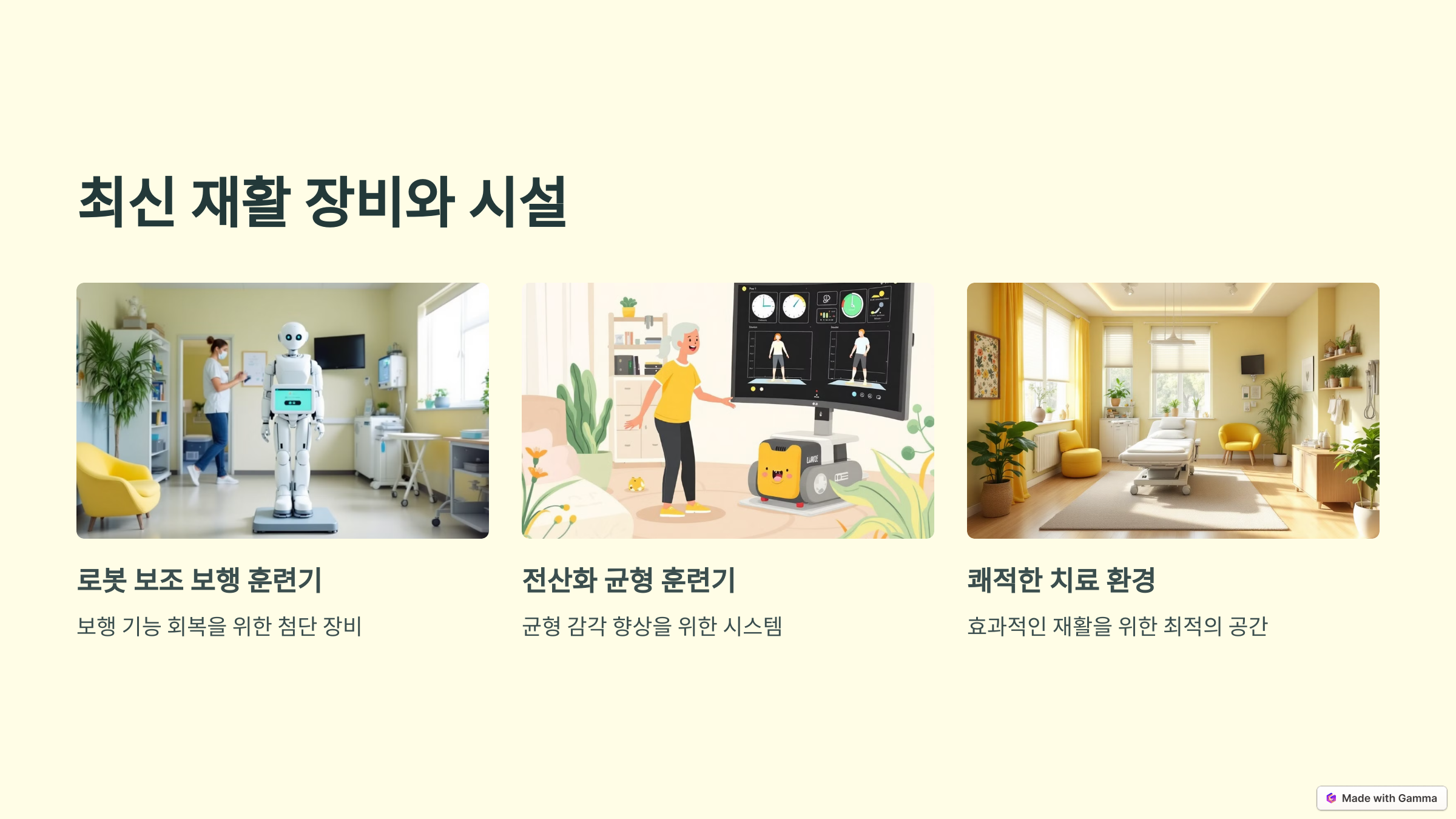 현대적인 재활 장비와 쾌적한 치료 환경은 재활 효과를 높이는 데 필수적입니다. 로봇 보조 보행 훈련기, 전산화 균형 훈련기 등 첨단 장비를 갖춘 병원을 선택하면 보다 효과적인 치료를 받을 수 있습니다.