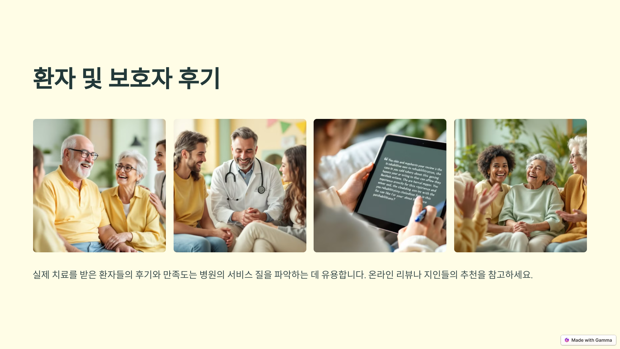 실제 치료를 받은 환자들의 후기와 만족도는 병원의 서비스 질을 파악하는 데 유용한 정보입니다. 온라인 리뷰나 지인들의 추천을 참고하여 병원의 평판을 확인하는 것이 좋습니다.