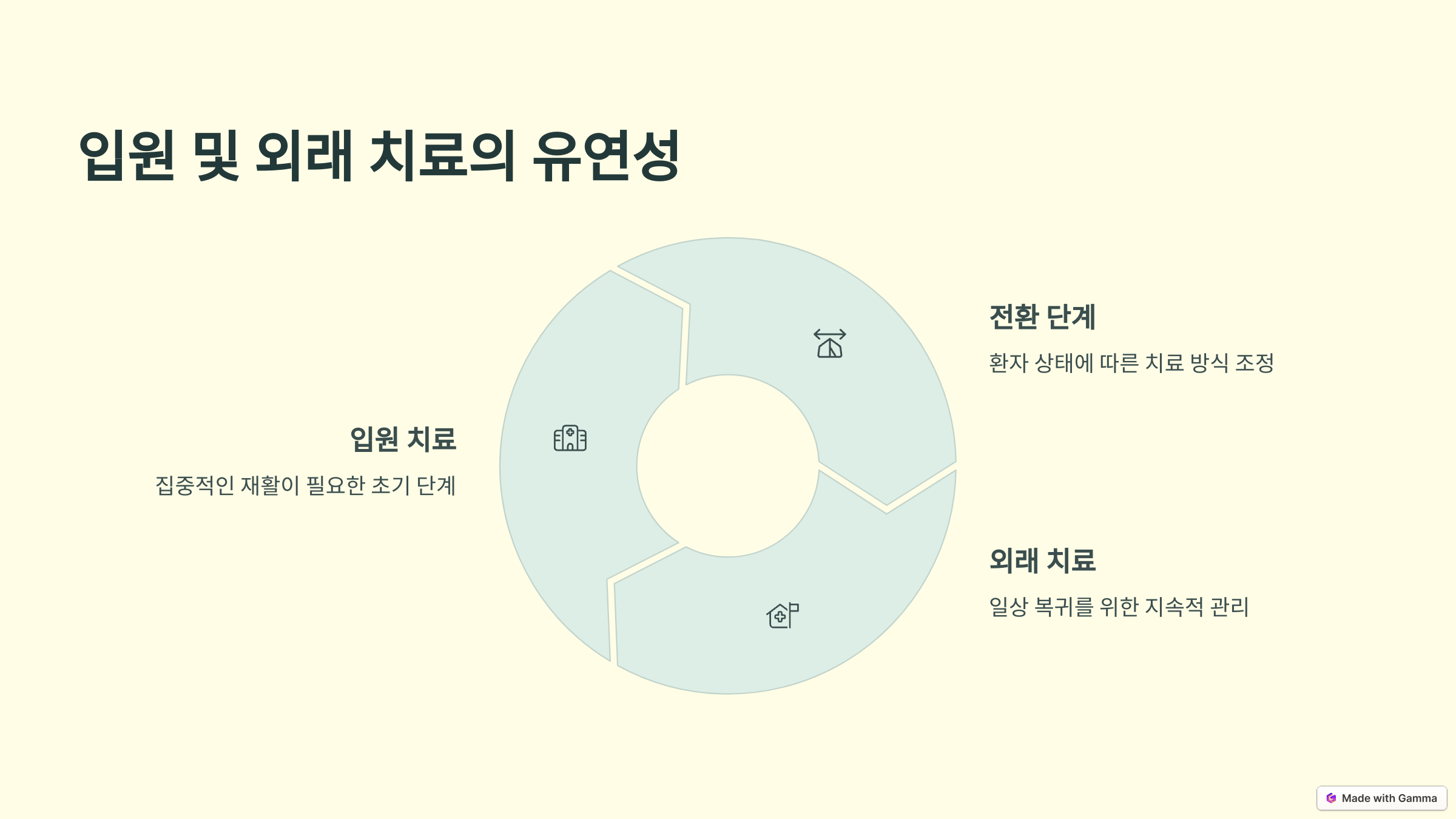 장기 입원이 필요한 경우와 외래 치료로 전환해야 하는 경우를 모두 지원하는 병원이 좋습니다. 환자의 회복 단계와 개인 사정에 따라 유연하게 대응할 수 있는 시스템이 필요합니다.