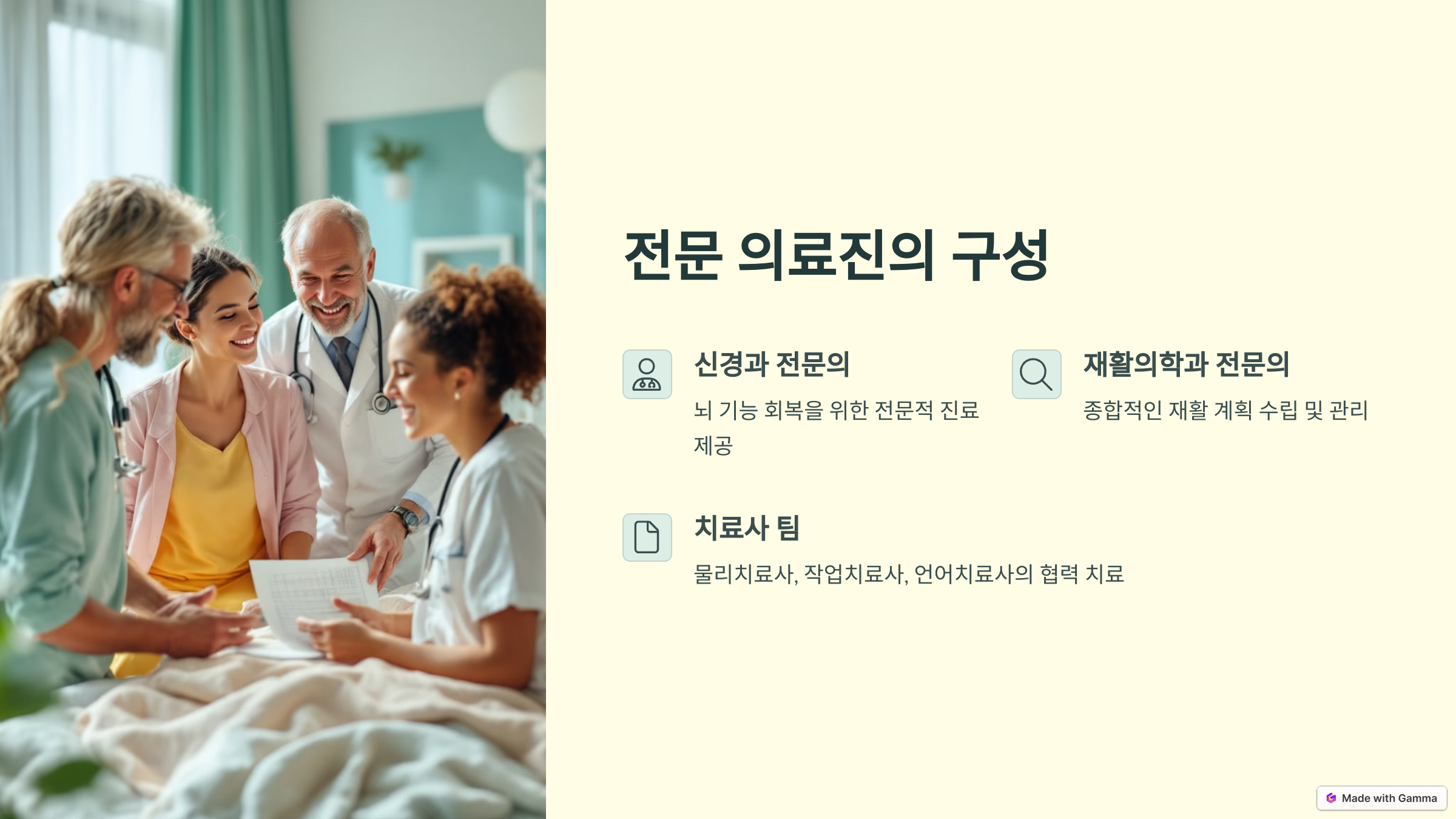 재활 치료는 다양한 전문 분야의 협력이 필요합니다. 신경과 전문의, 재활의학과 전문의, 물리치료사, 작업치료사, 언어치료사 등이 팀을 이루어 환자에게 최적의 치료를 제공하는 병원을 선택해야 합니다. 이러한 다학제적 접근은 환자의 전반적인 회복에 큰 도움이 됩니다.