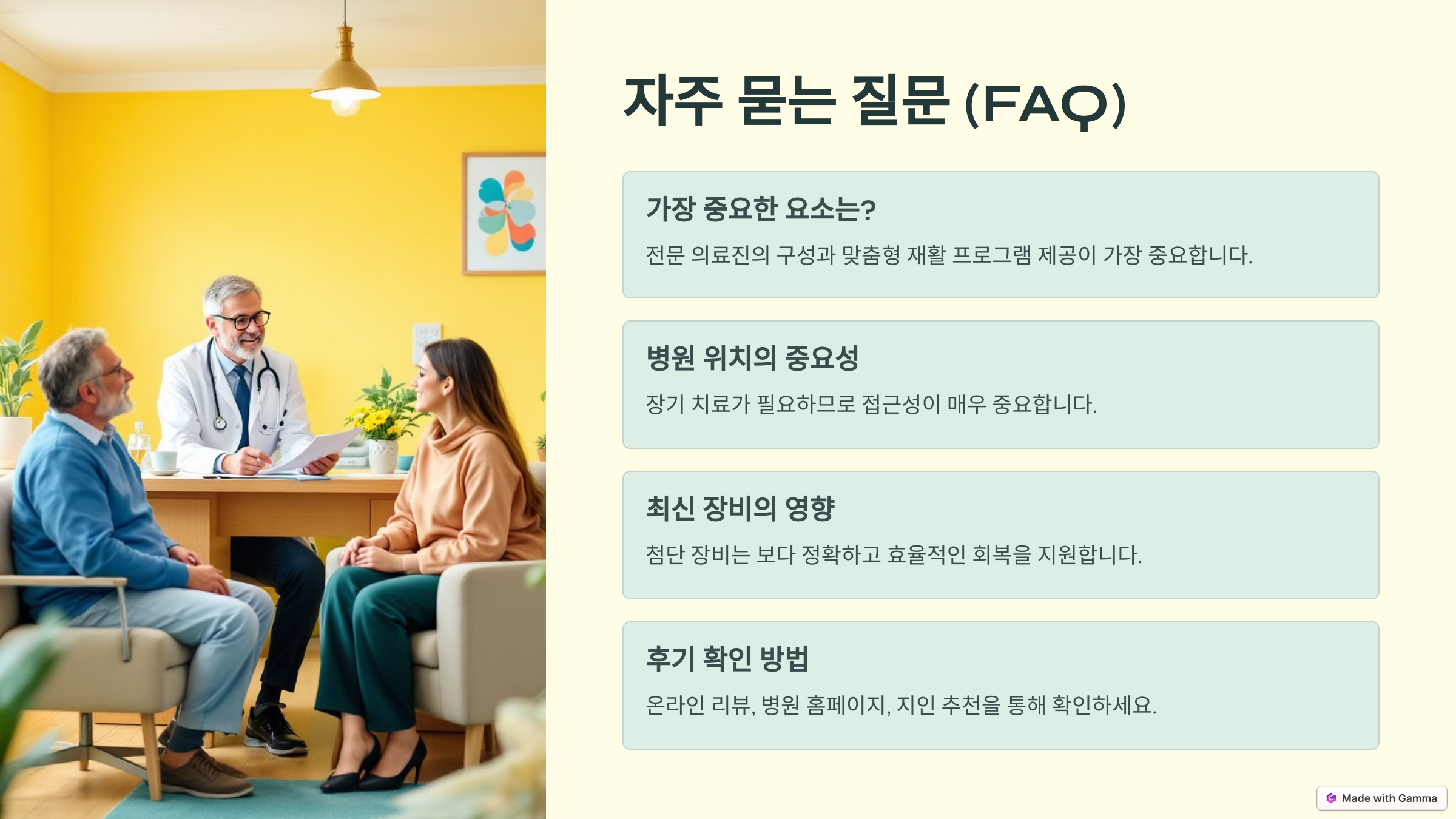 A4. 재활 과정 중 예기치 않은 응급 상황이 발생할 수 있으므로, 신속하게 대응할 수 있는 시스템이 갖춰진 병원을 선택하는 것이 안전합니다.