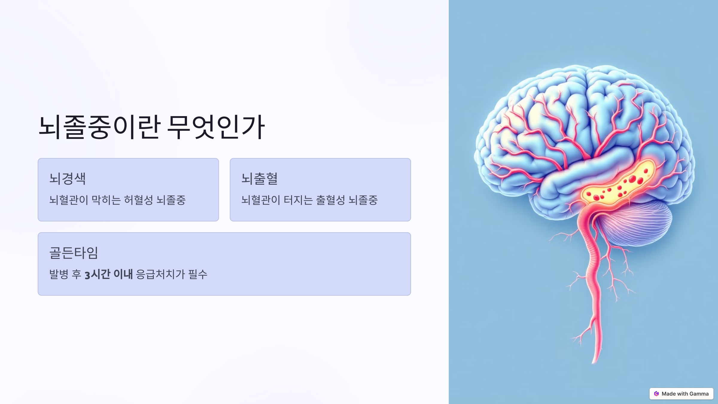 뇌졸중은 뇌에 혈액 공급이 차단되거나 출혈이 발생하면서 뇌 조직이 손상되는 질환이에요. 보통 ‘중풍’이라고 불리며, 뇌혈관이 막히는 허혈성(뇌경색)과 터지는 출혈성(뇌출혈)으로 나뉘어요. 중요한 건, 발병 후 **3시간 이내**에 응급처치를 받아야 뇌 손상을 최소화할 수 있다는 점이에요. 그래서 ‘골든타임’이라는 말이 나오는 거죠. 😱