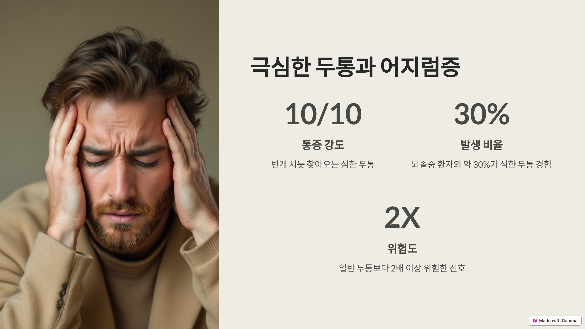 보통의 두통과는 다르게, 갑자기 번개 치듯 찾아오는 심한 두통은 뇌졸중의 전조 증상일 수 있습니다. 특히 어지럽고 중심을 못 잡는 느낌까지 동반된다면 즉시 병원을 찾으셔야 합니다.