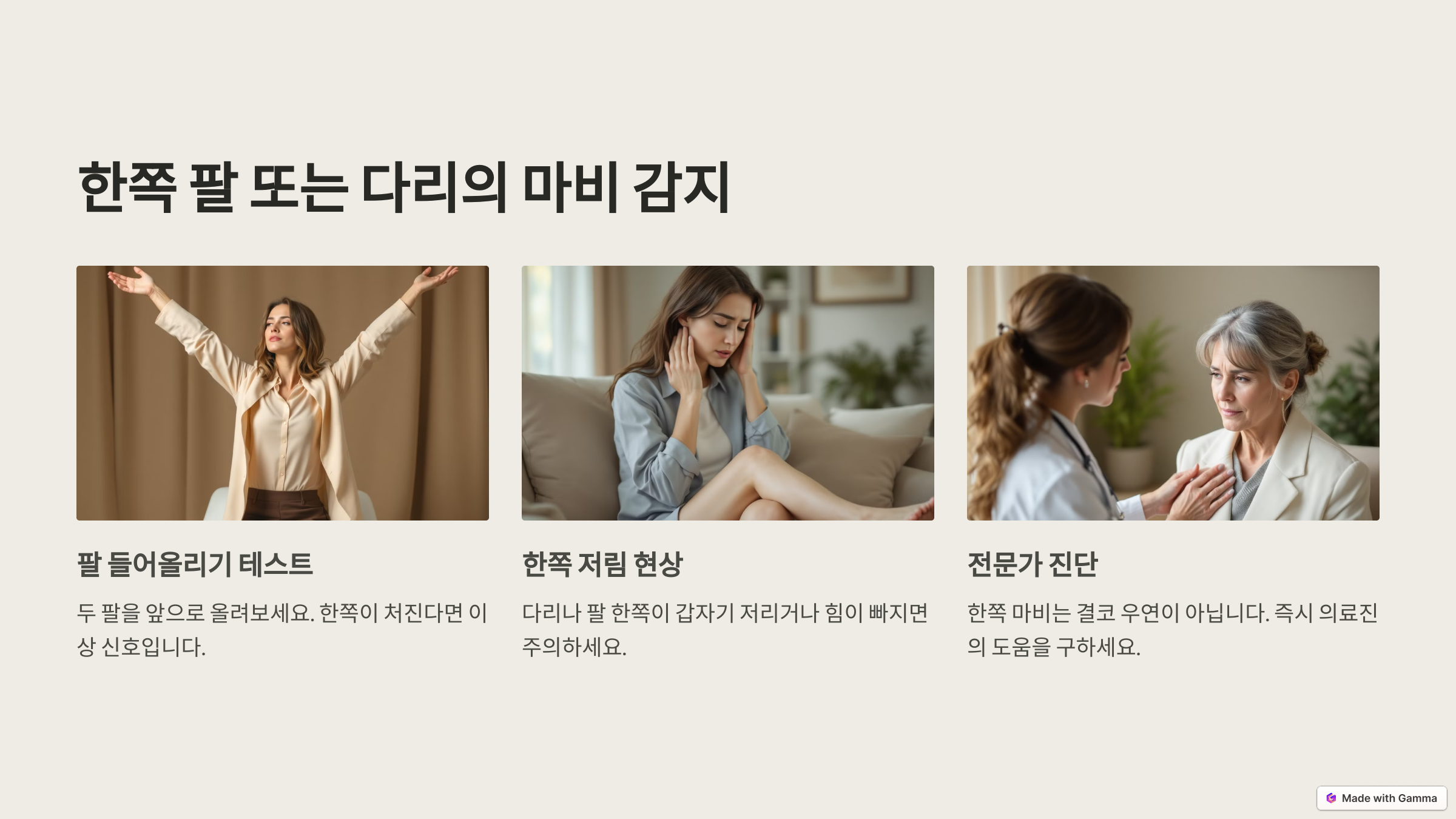 자리에 앉아서 두 팔을 앞으로 올려보세요. 한쪽이 처진다면 이상 신호입니다. 저희 어머니도 이런 증상으로 조기에 병원을 찾아 다행히 큰 후유증 없이 회복하셨어요. 한쪽 마비는 결코 우연이 아닙니다.