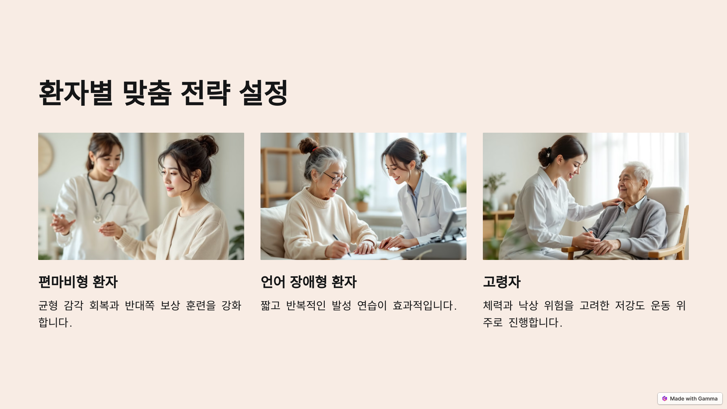 - **언어 장애형 환자**: 짧고 반복적인 발성 연습
