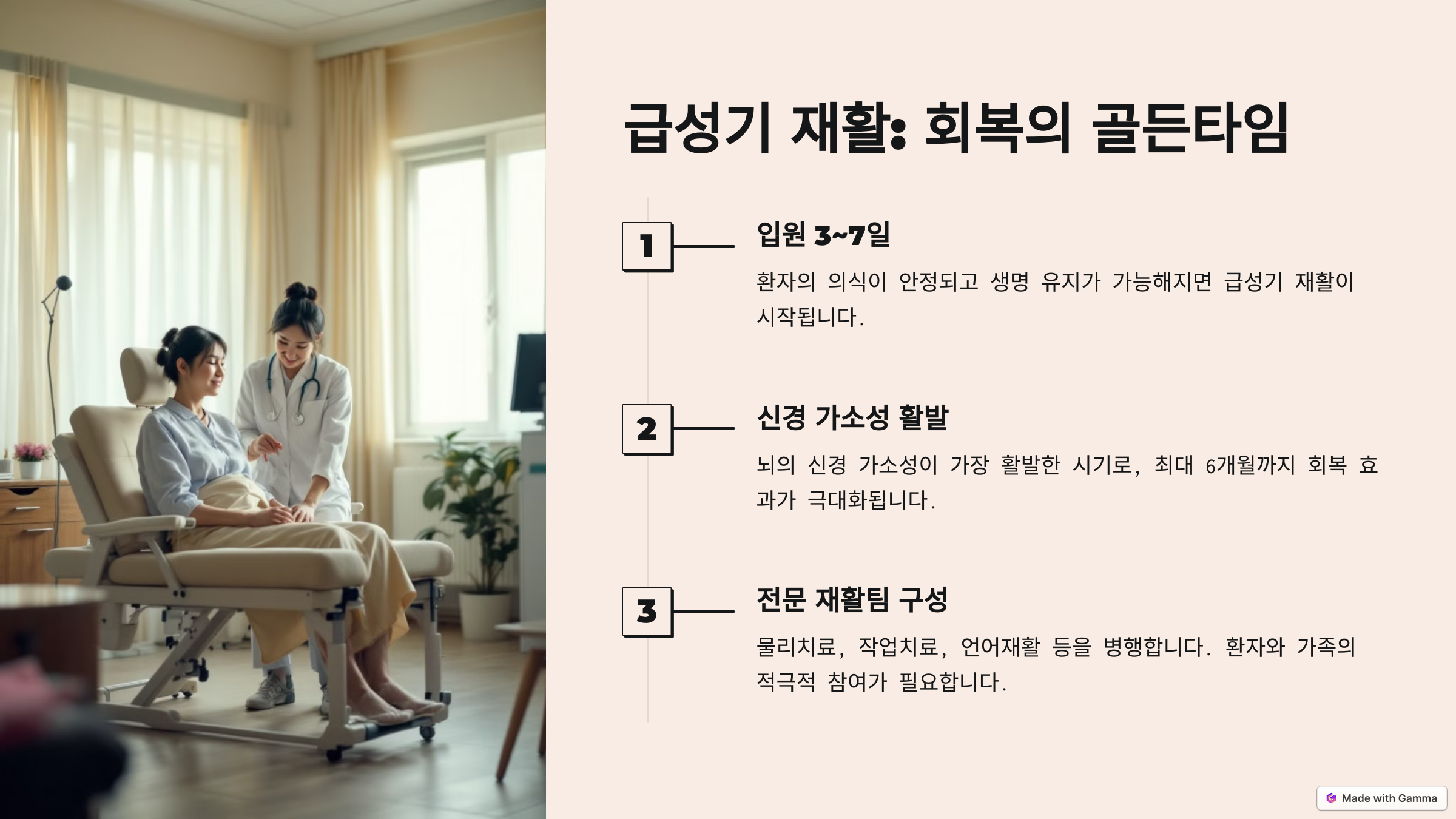 이 시기는 뇌의 **신경 가소성**이 가장 활발한 시기로, **최대 6개월까지 회복 효과가 극대화**되죠.