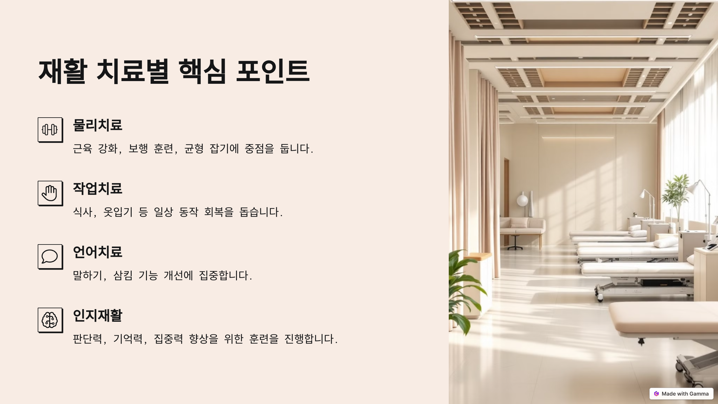 - **작업치료**: 일상 동작 (식사, 옷입기 등) 회복