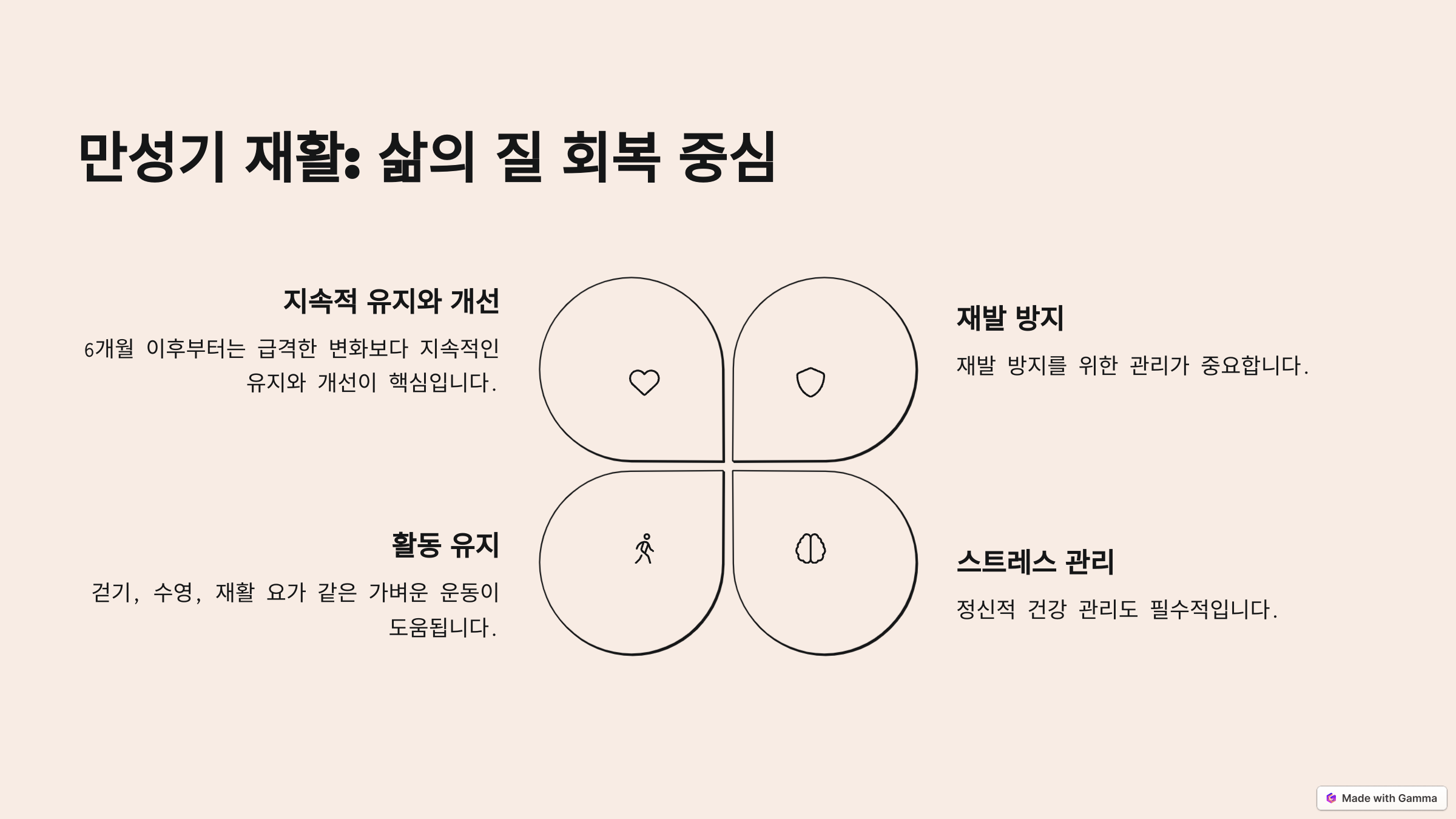 이 단계에서 중요한 건 **재발 방지, 스트레스 관리, 활동 유지**예요. 걷기 운동, 수영, 재활 요가 같은 가벼운 운동도 큰 도움이 됩니다.